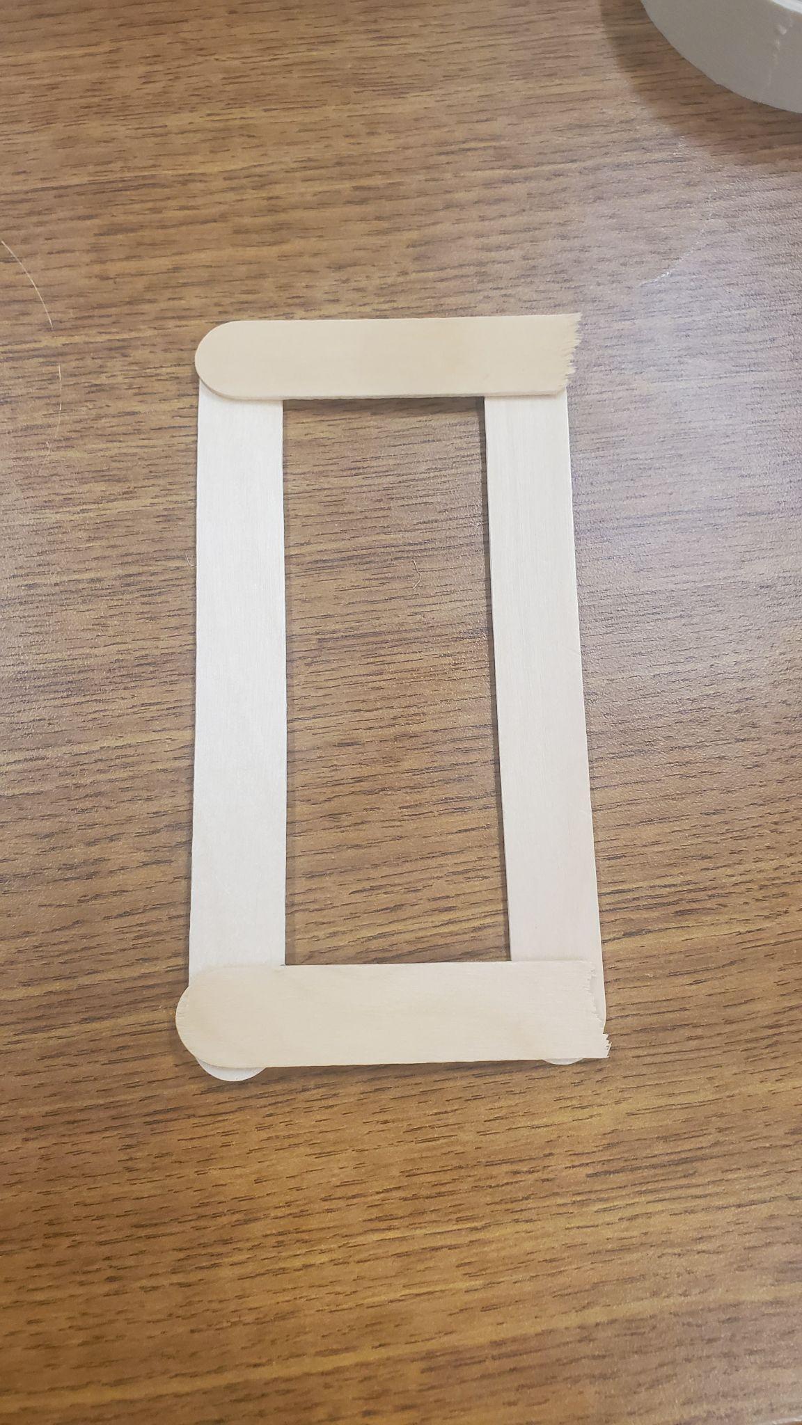 Take 2 more full large popsicle sticks and hot glue the halves parallele making a box 1 by 1/2 popsicle sticks. Make sure both halves are hot glued on top.