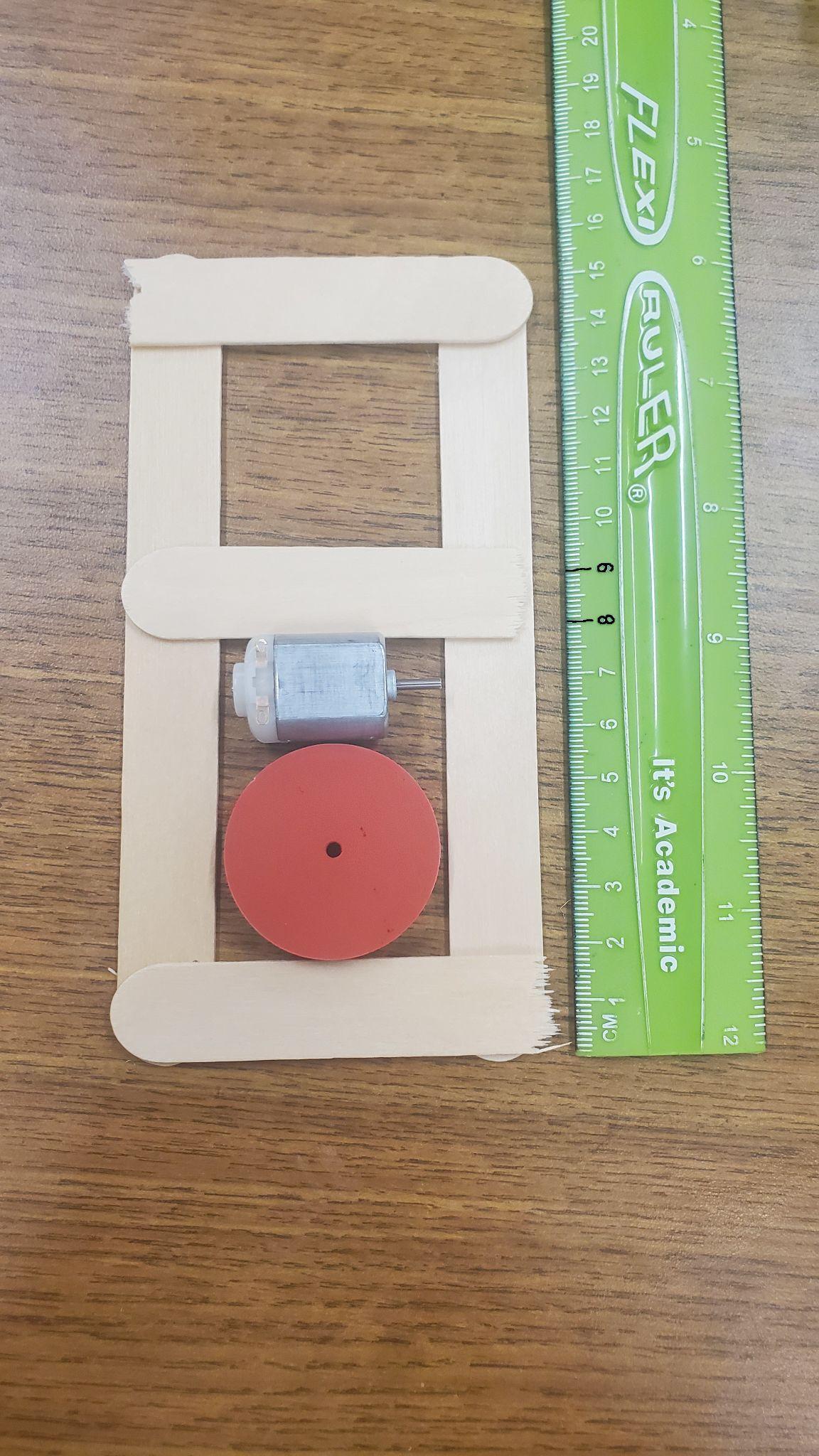 Lay the large 3d printed wheel and motor from the bottom of the box. Lastly lay and hot glue the half popsicle stick across. Or use a ruler and measure around 8cm to 9cm where it should lay. MAKE SURE: the 3rd half that is glued in the center is also on top of the longer pieces. All the halves should be level with each other.
