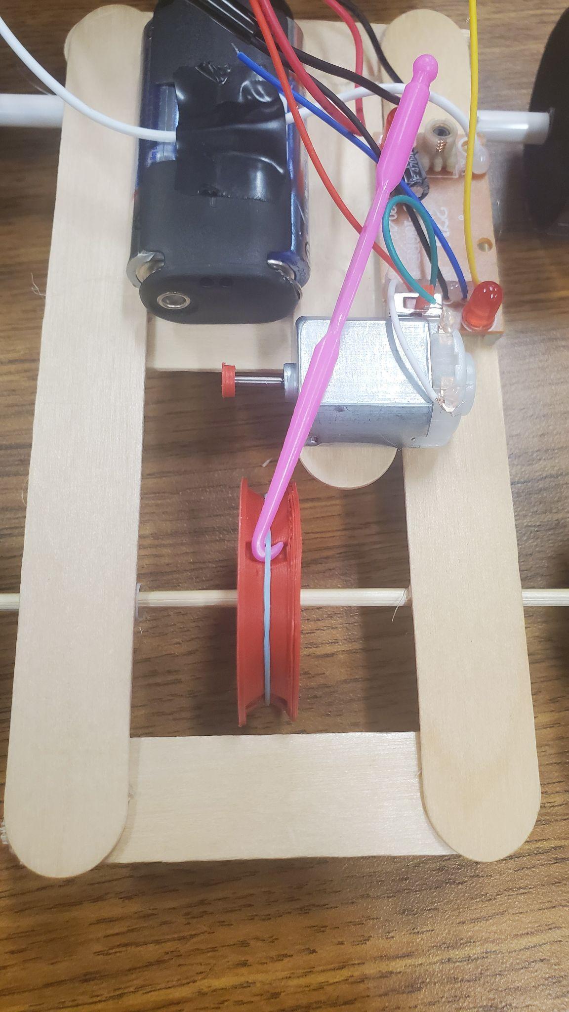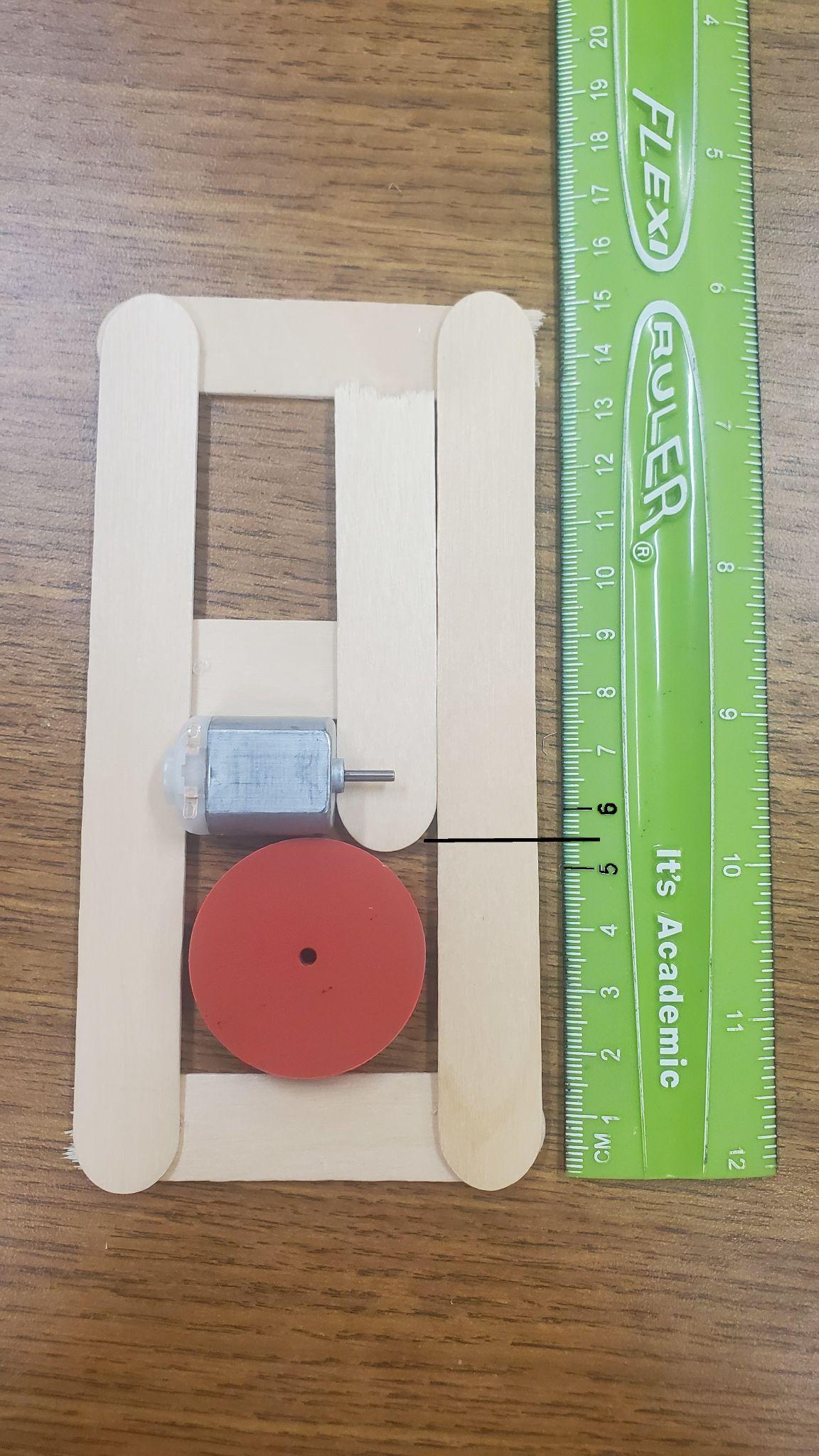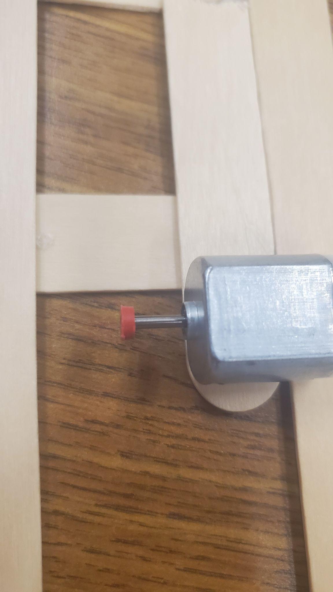 Flip the base of hot glued popsicle sticks over. Place the large 3d printed wheel down along with the dc motor similar to how it was in the last step. Hot glue the last half large popsicle stick down around 5 cm from the bottom of the structure. (it should be just above the 3d printed wheel and exactly on the dc motor).