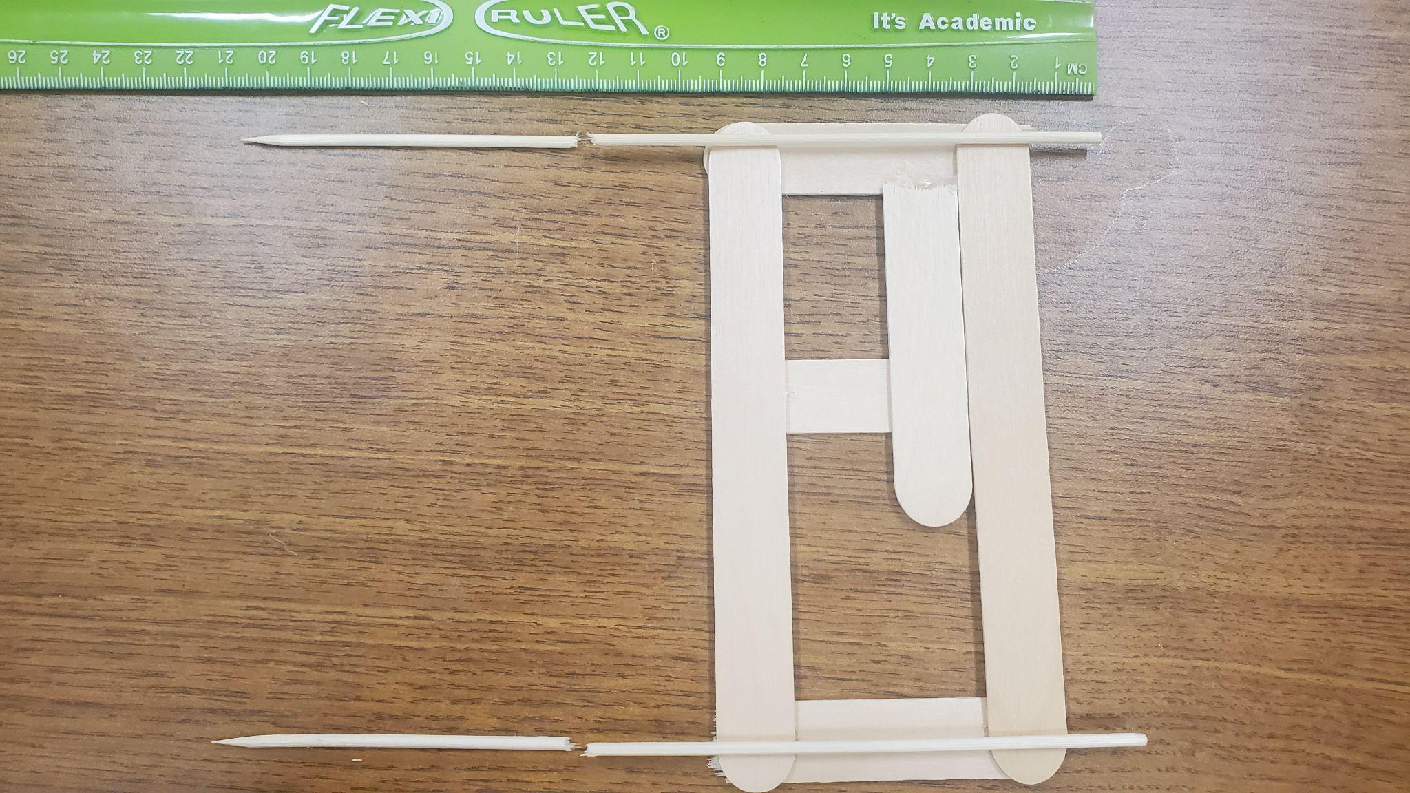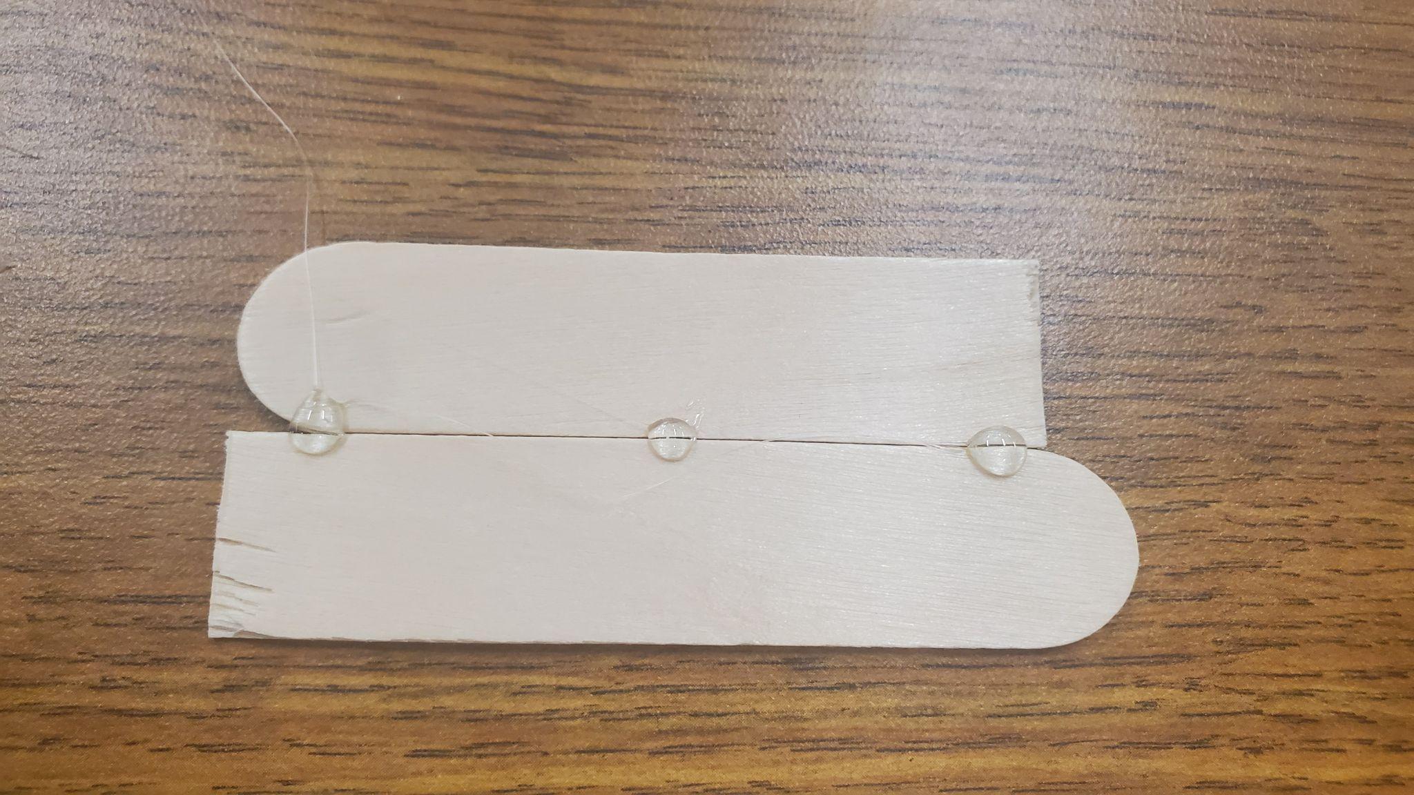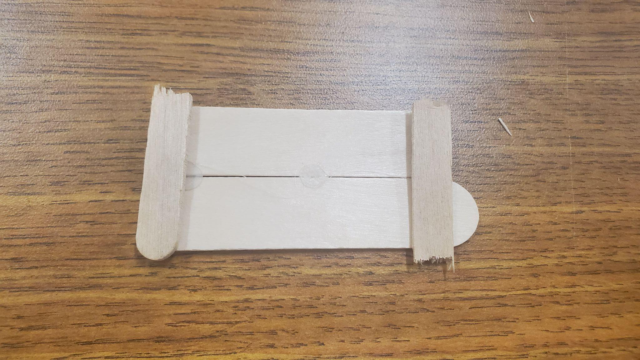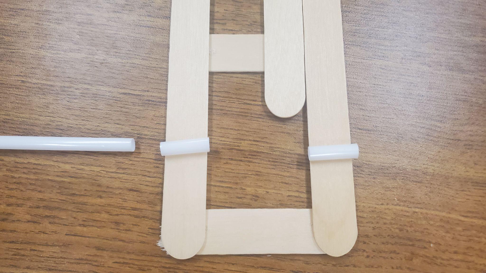 Take the rest of the popsicle sticks left and snap off two small parts and tack them with hot glue.