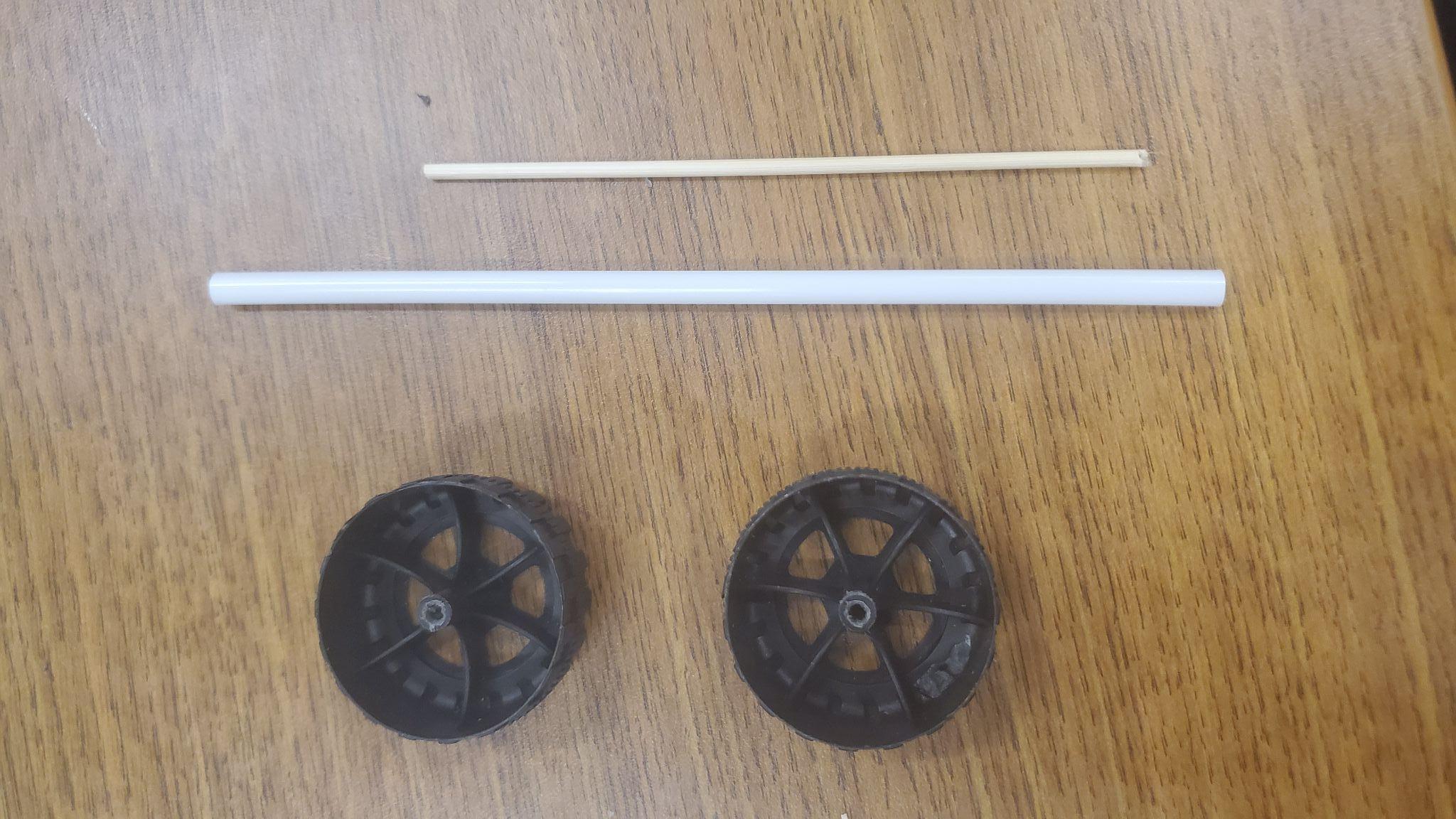 Take 2 wheels, 1 thin skewer and the rest of the straw.