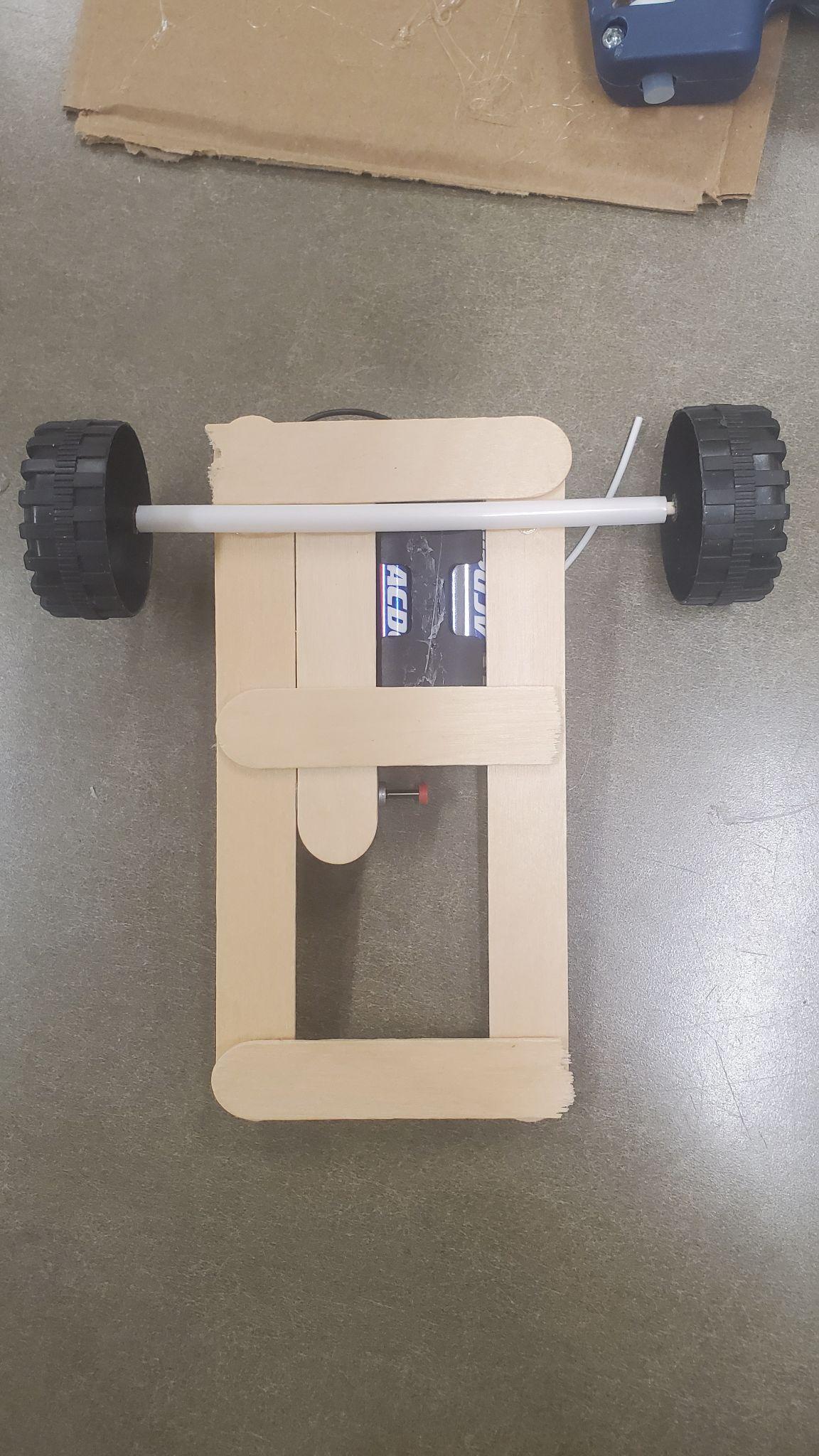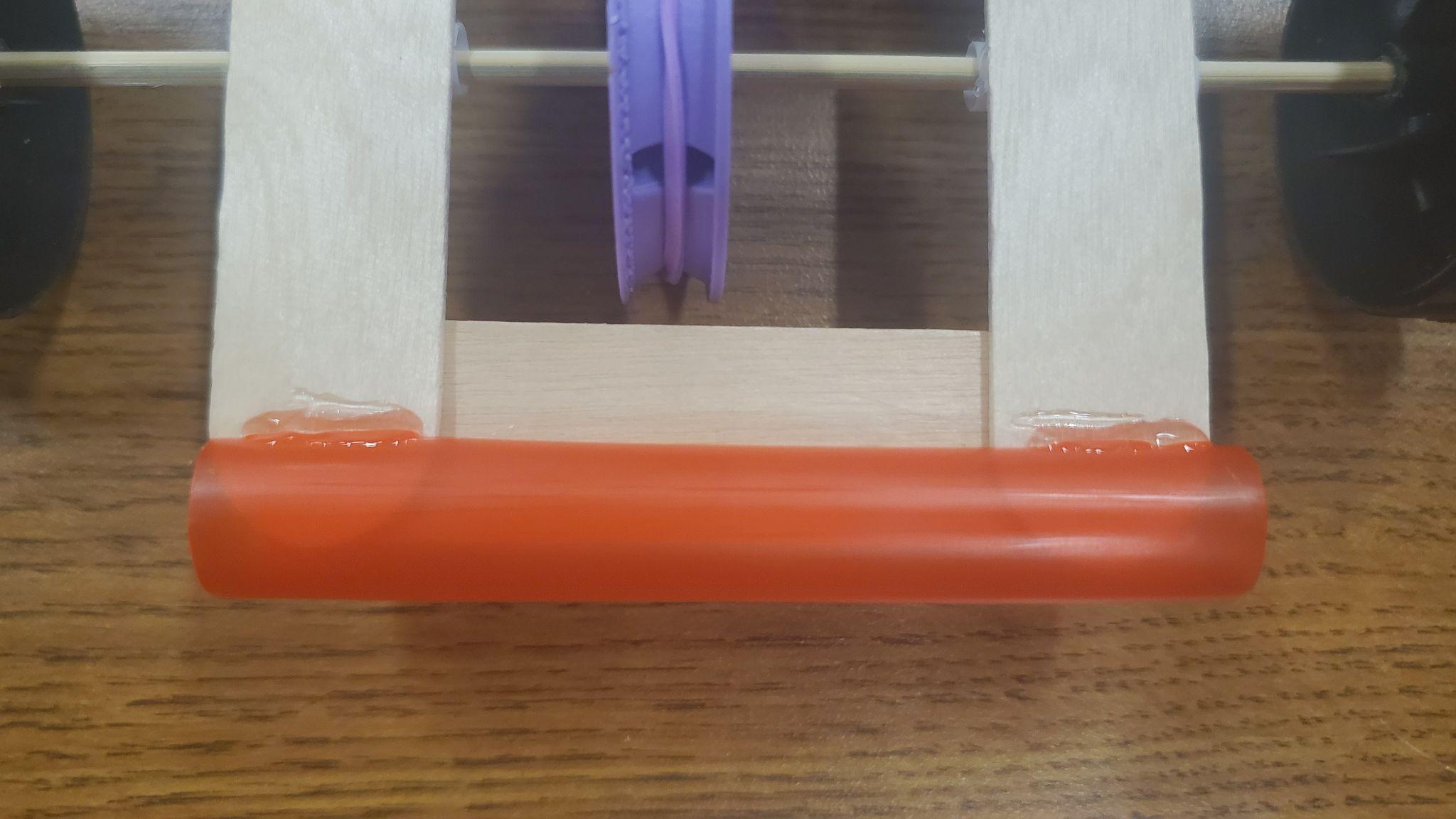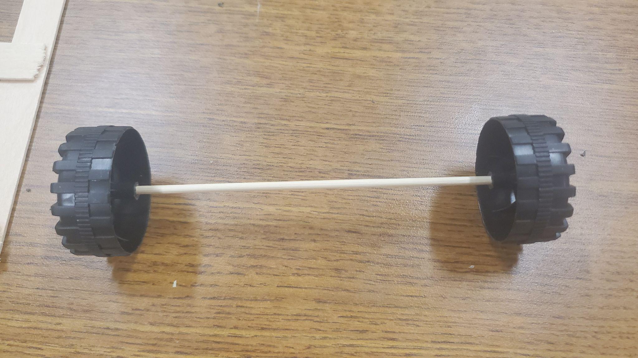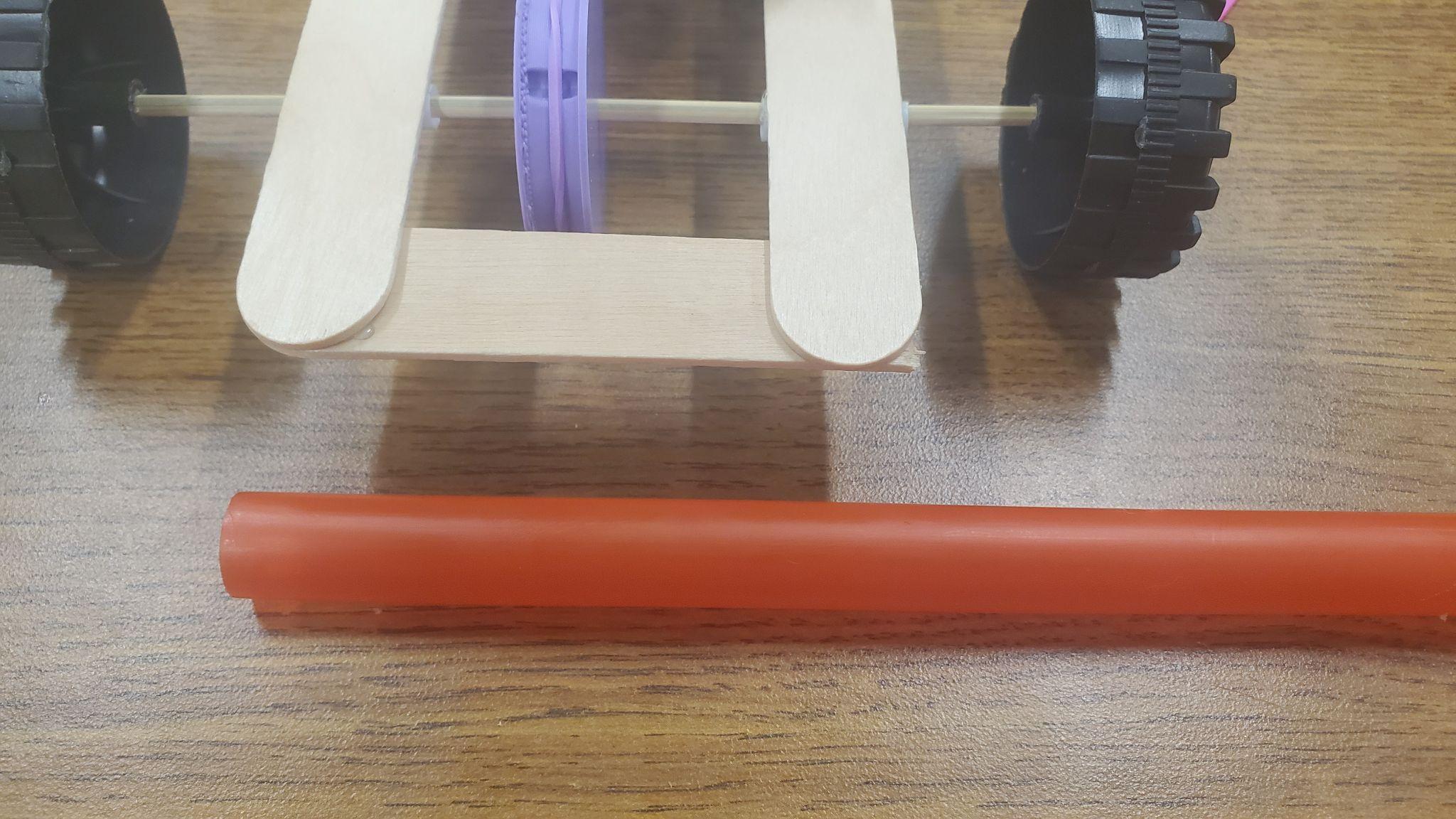 Flip the car over gently and hot glue the back wheels across the back half popsicle stick. ONLY HOT GLUE THE STRAW NEVER THE SKEWER OR WHEELS.