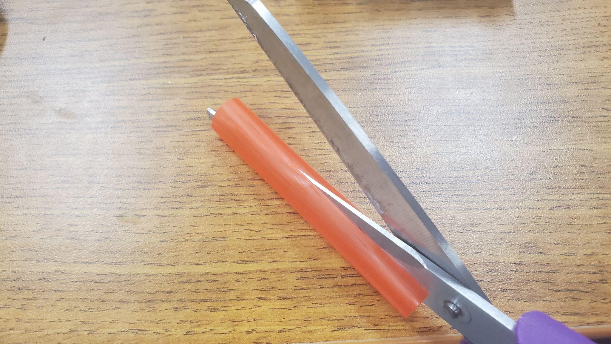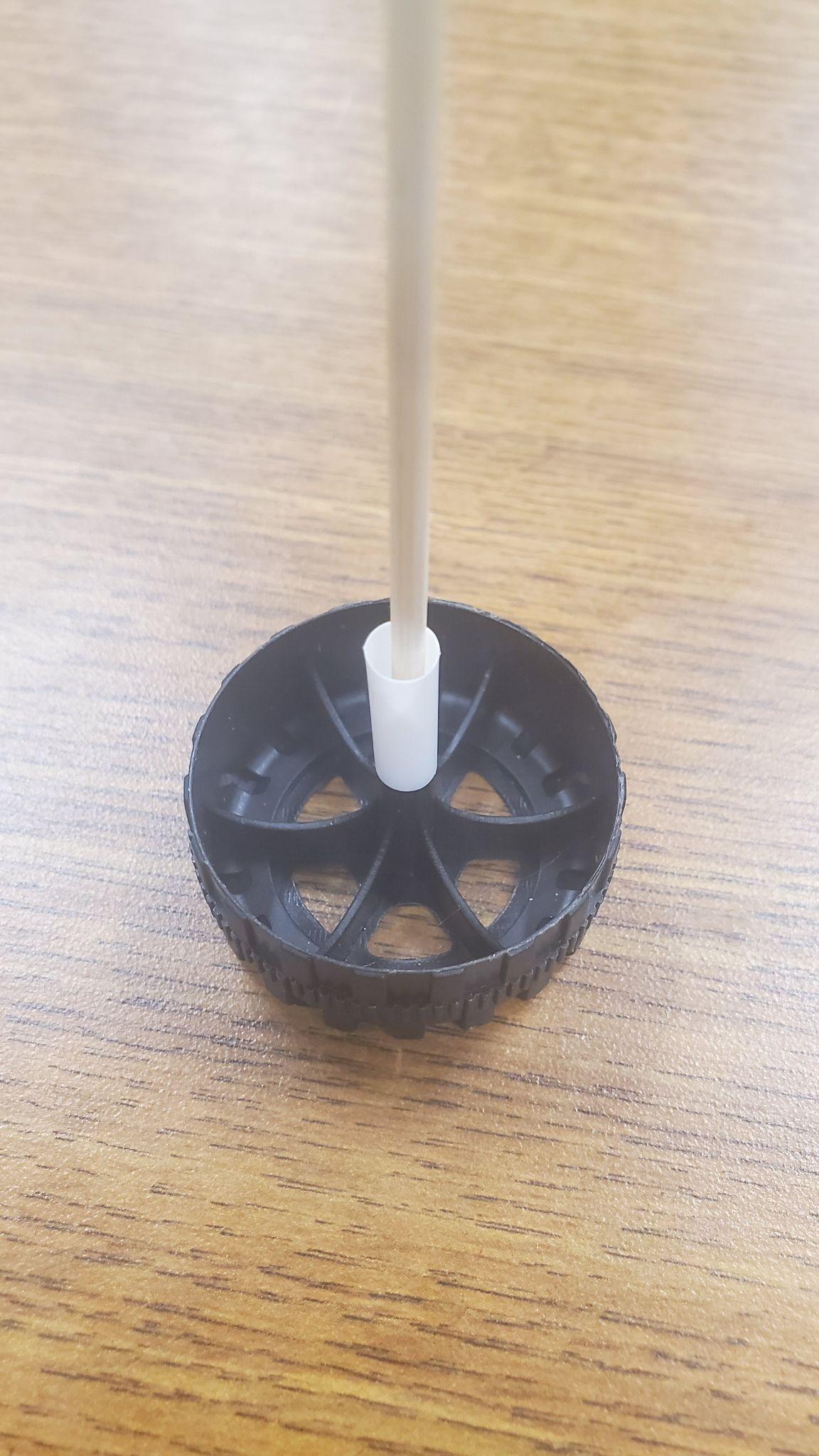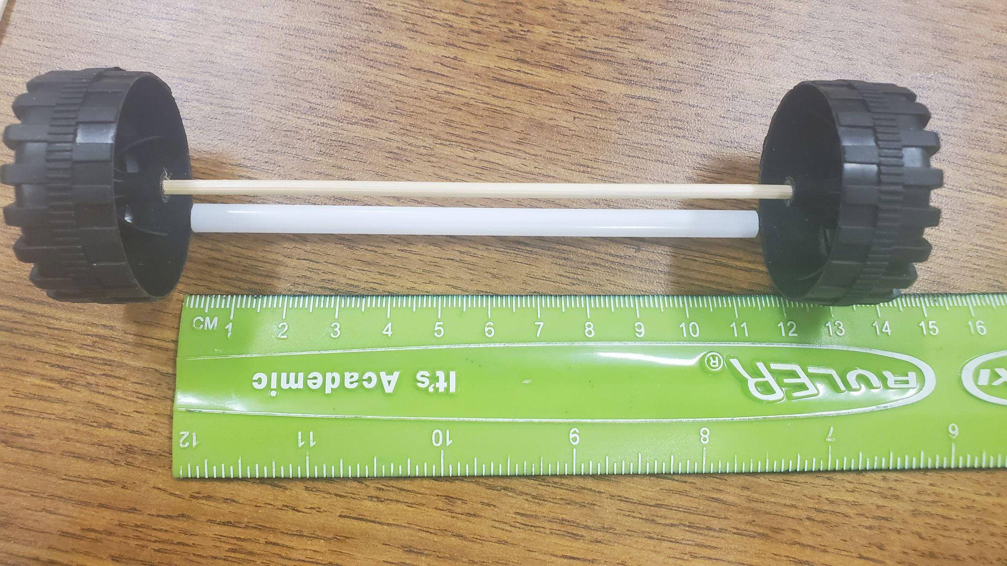 Measure and cut the straw to the length of the skewer with the wheels attacked. Around 11.5cm.