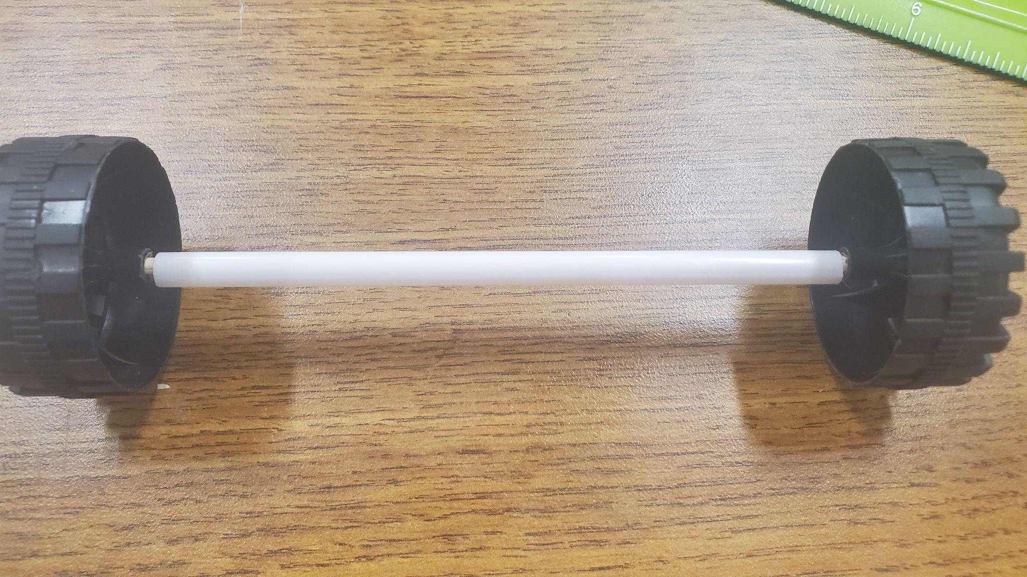 Take one of the wheels off and slide the straw on then reattach the wheel. If you notice that the straw is still touching the wheels on both sides then cut it a little bit shorter. it should be close but should have enough space on either side to not touch any wheel.