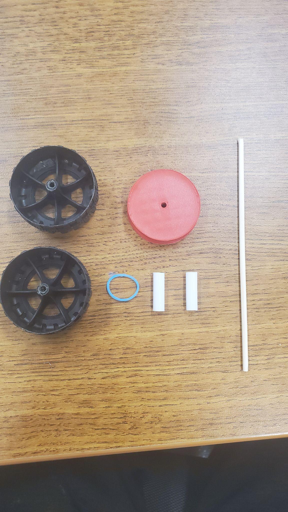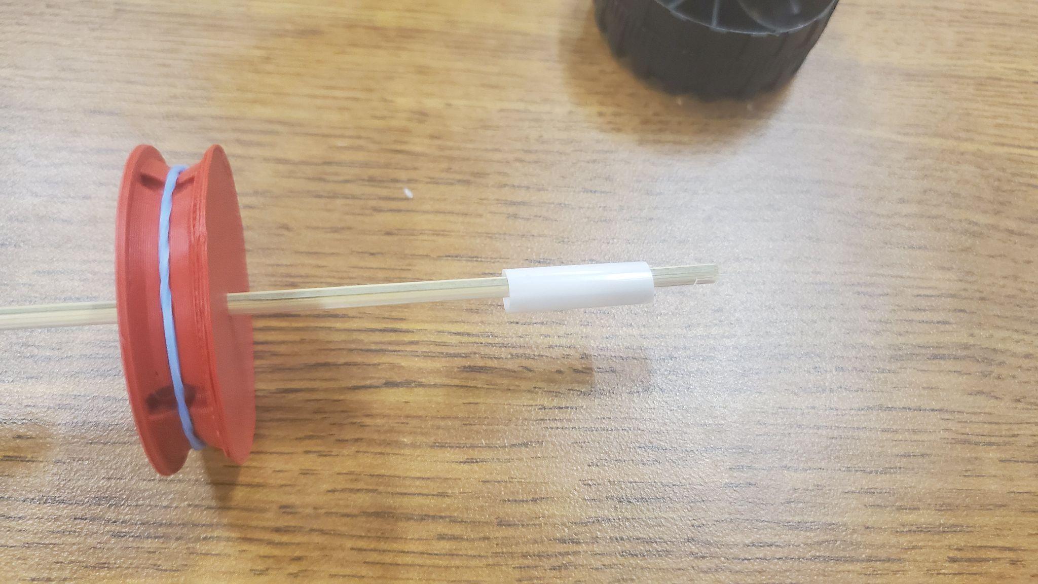 Now for the front wheel assembly Take the 3d printed wheel, the remaining two wheels, the small cut pieces of straw, the remaining thin skewer and an elastic.