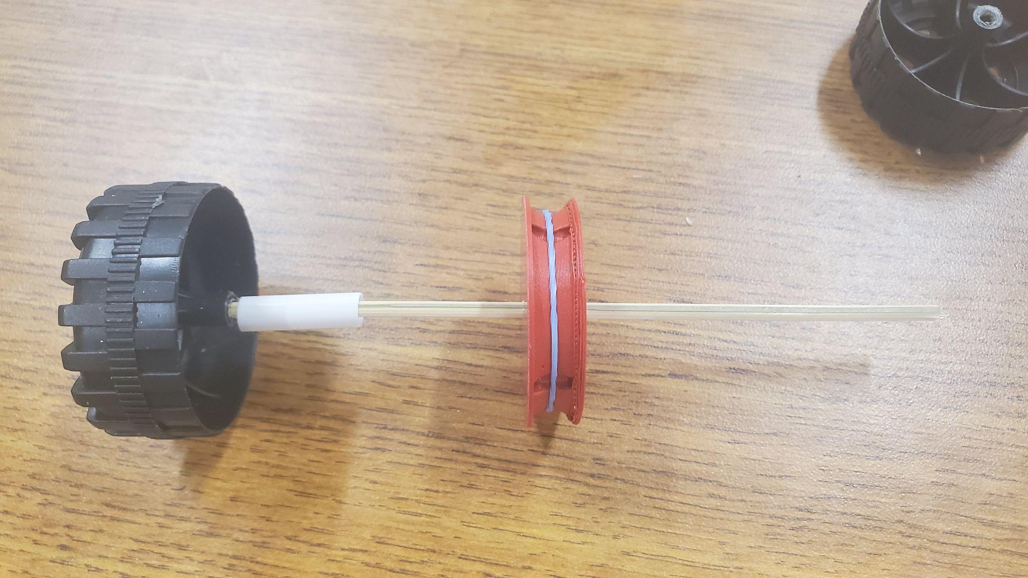 Flip the car back over. Use the elastic tool to grab the elastic out of the 3d printed wheel. And attach it to the motor.