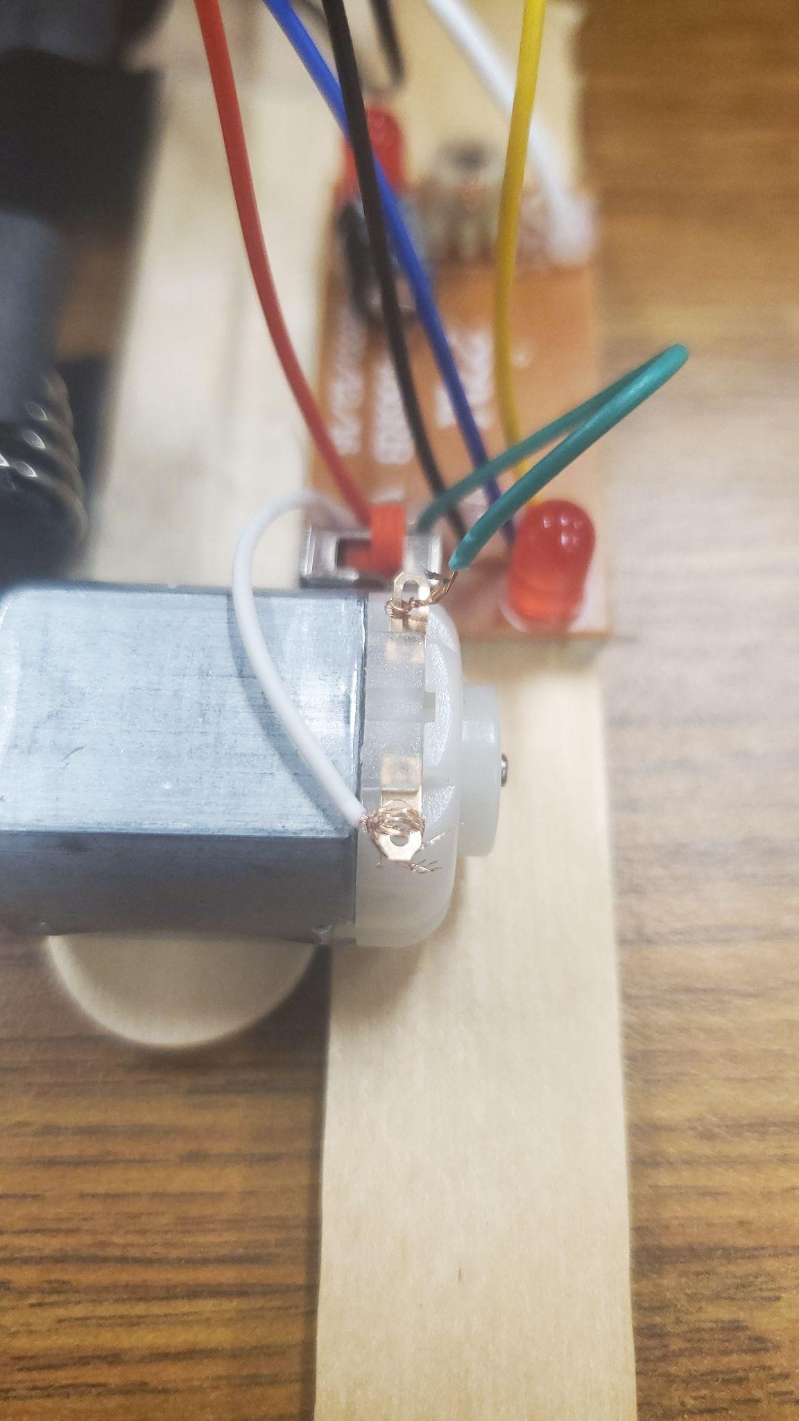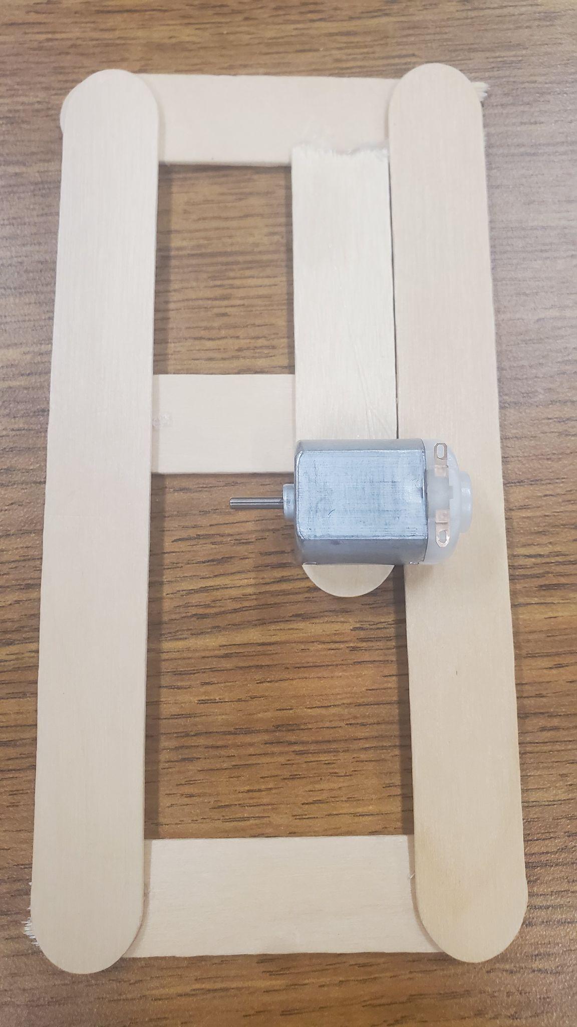 Hot glue the dc motor across the popsicle sticks leaving the spinning shaft out in the open air. MAKE SURE the copper connections are facing up!