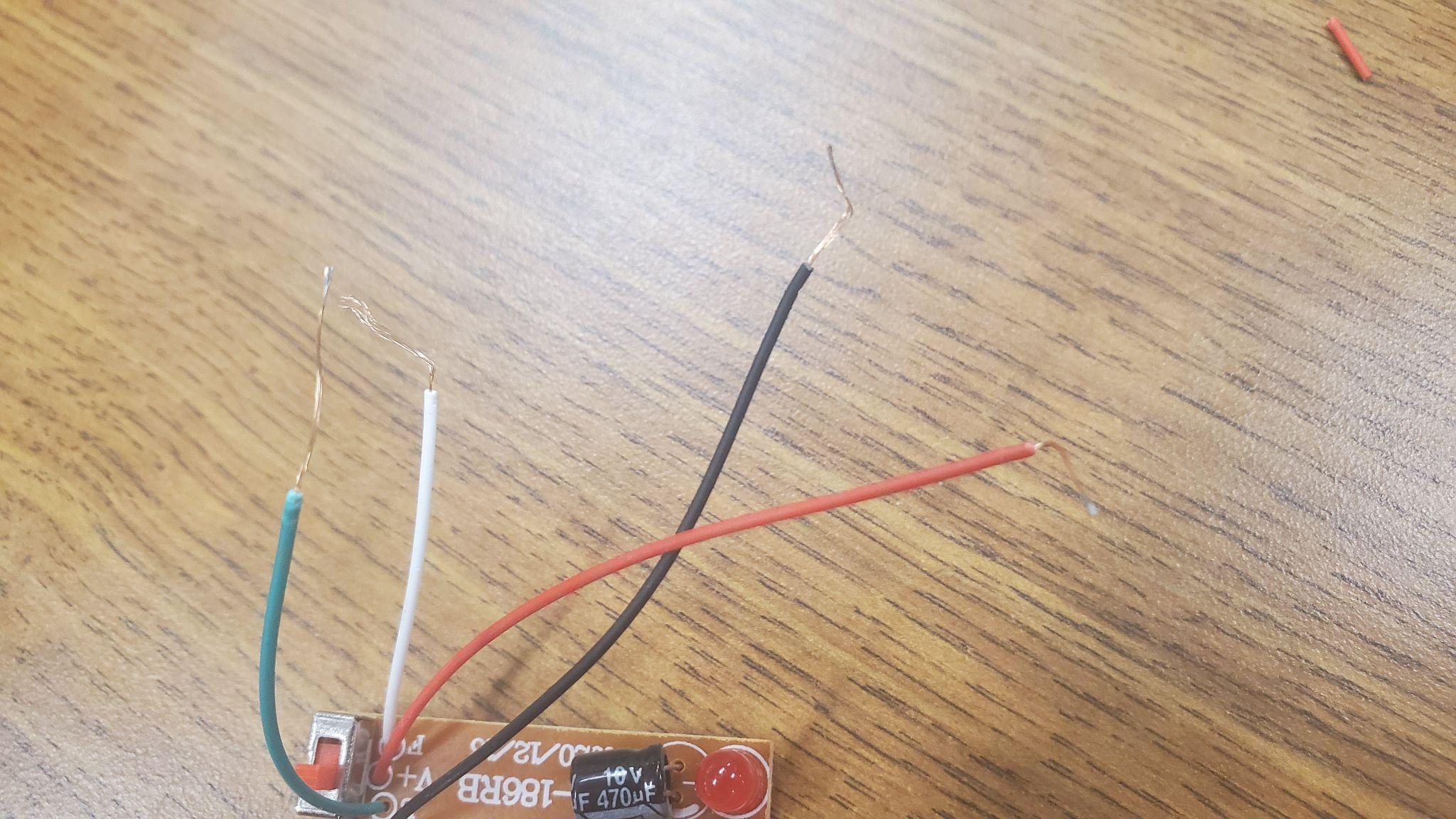 Wire strip the red, black, SHORT white and green wires of the RF receiver circuit board DO NOT TOUCH THE LONG WHITE CORD YET These wires are labelled: V+ red V- black B green F white on the circuit board BE VERY CAREFUL to NOT accidentally cut the wires when doing this. They are short and will make it harder to connect them later. If they are cut too short then solder or attach a longer wire onto it as replacement.