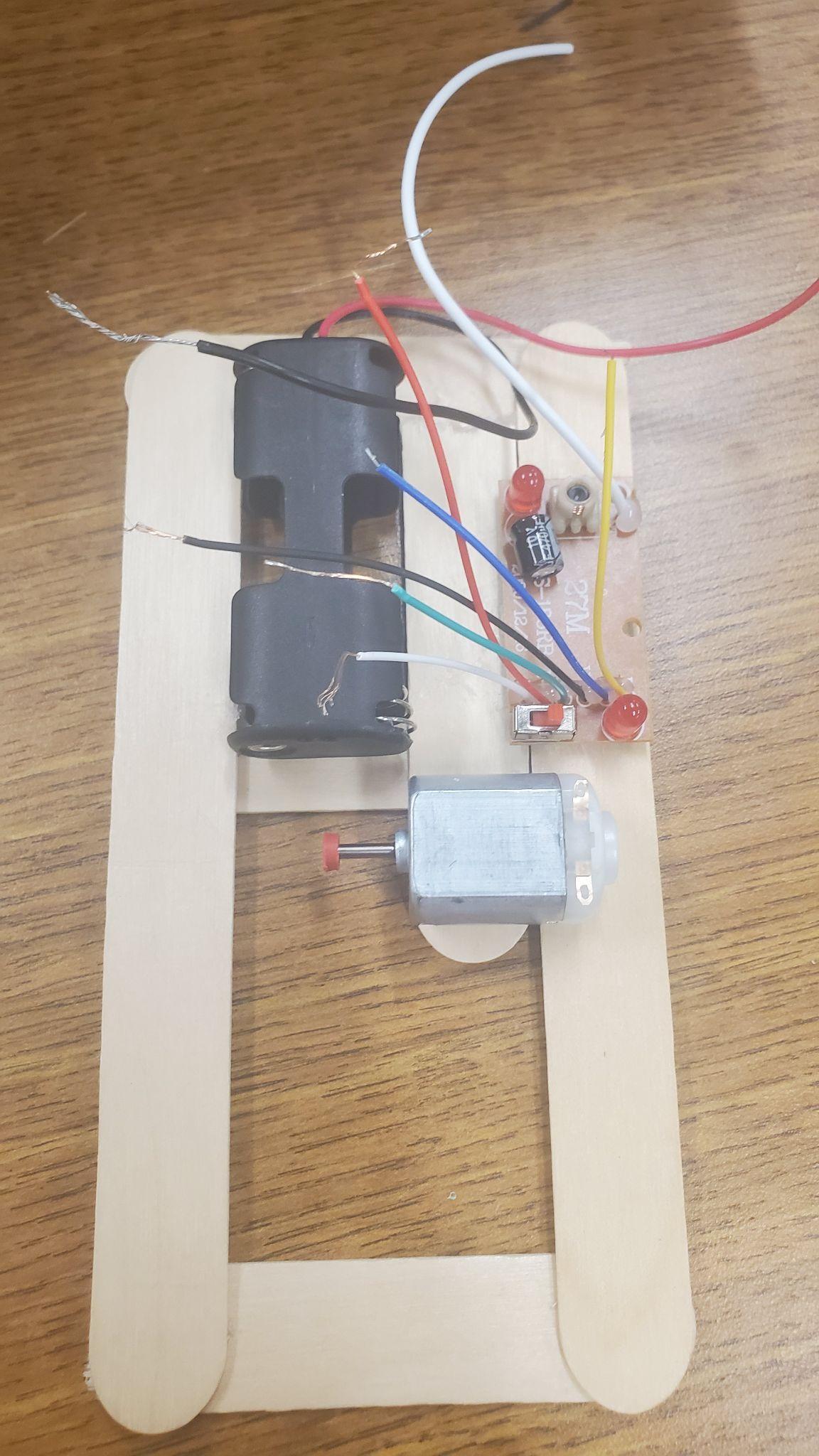 Hot glue the battery holder to the car structure filling the gap on the left. Make sure the wires facing out from the car and do not interfere with the motor.