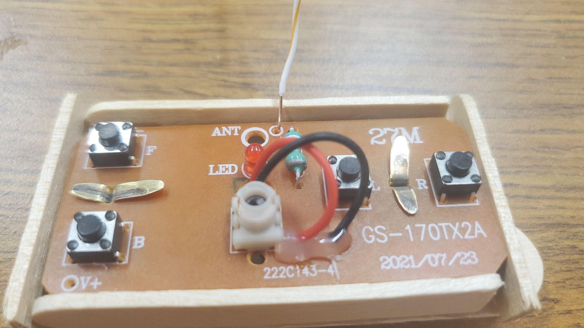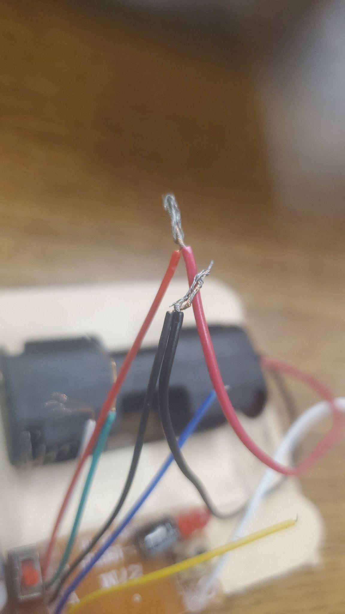 Twist the red and black wires together from the battery hub and the RF receiver circuit.