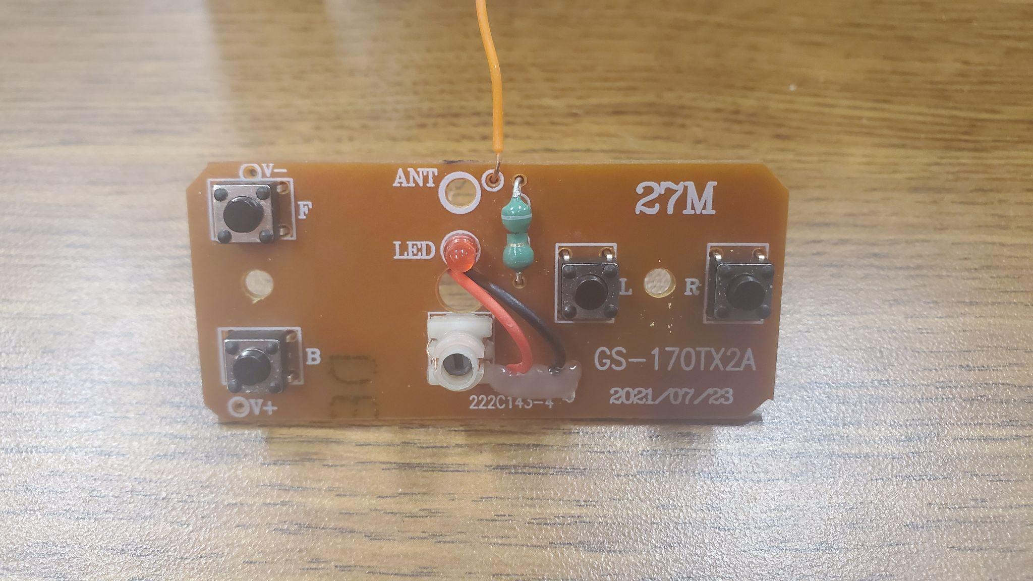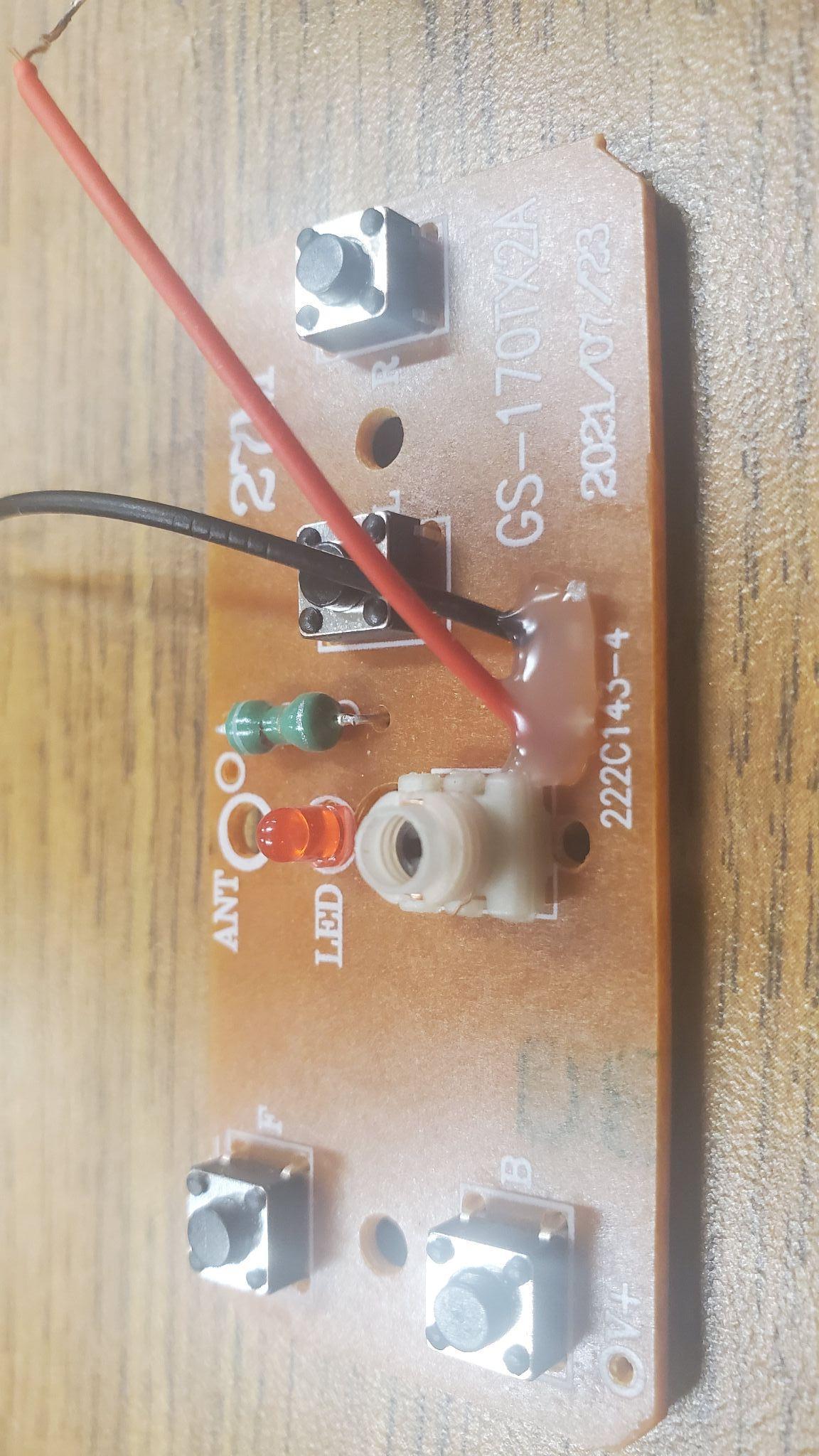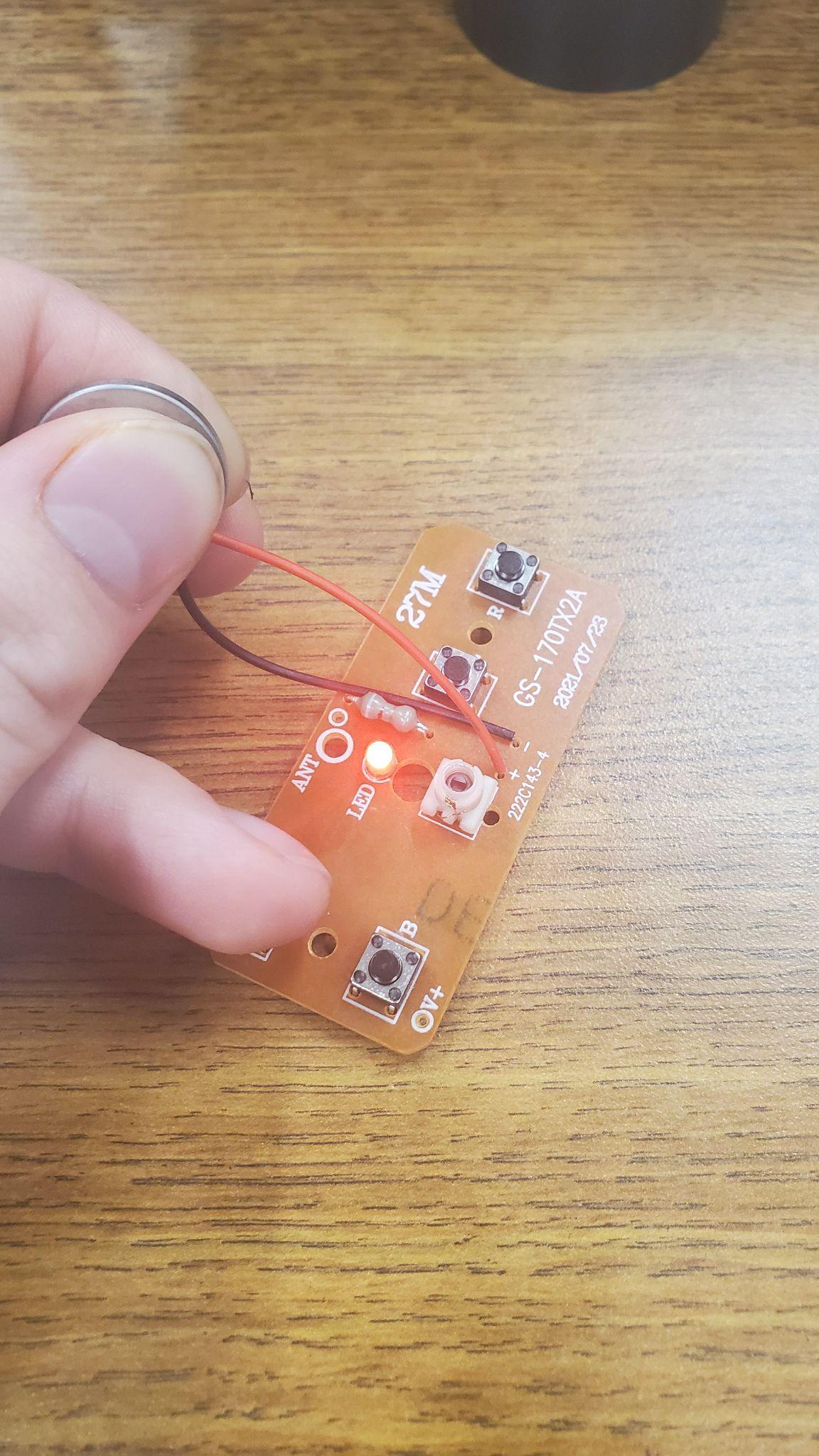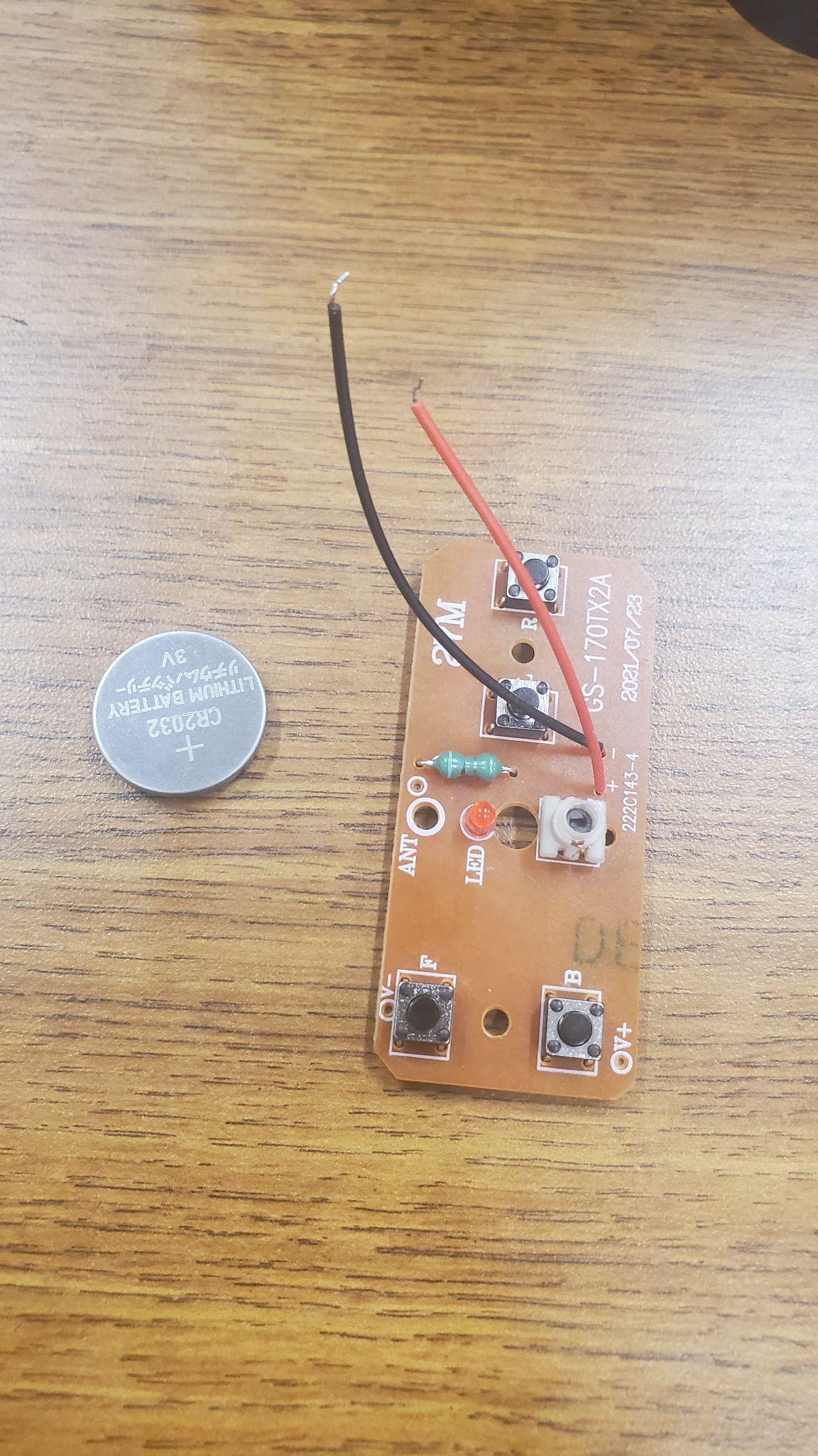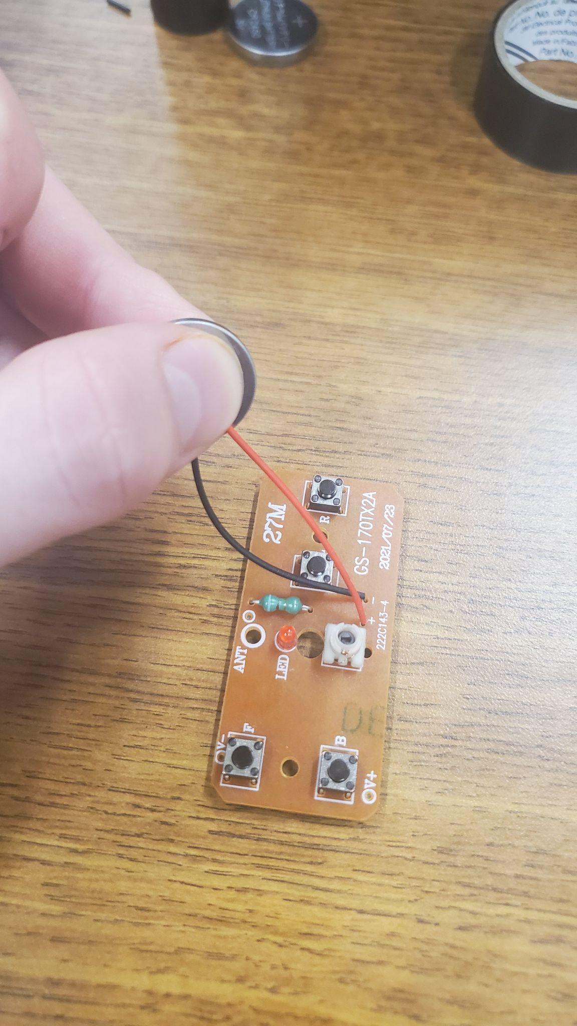 Next take the 3v coin battery and the RF Transmitter circuit board and hold the negative and positive wires to the battery Red wire goes to the side of the battery with the “+” sign and Black wire goes to the other side of the battery. When pressing the button labelled F or B you should see the red light up on the Transmitter circuit board.