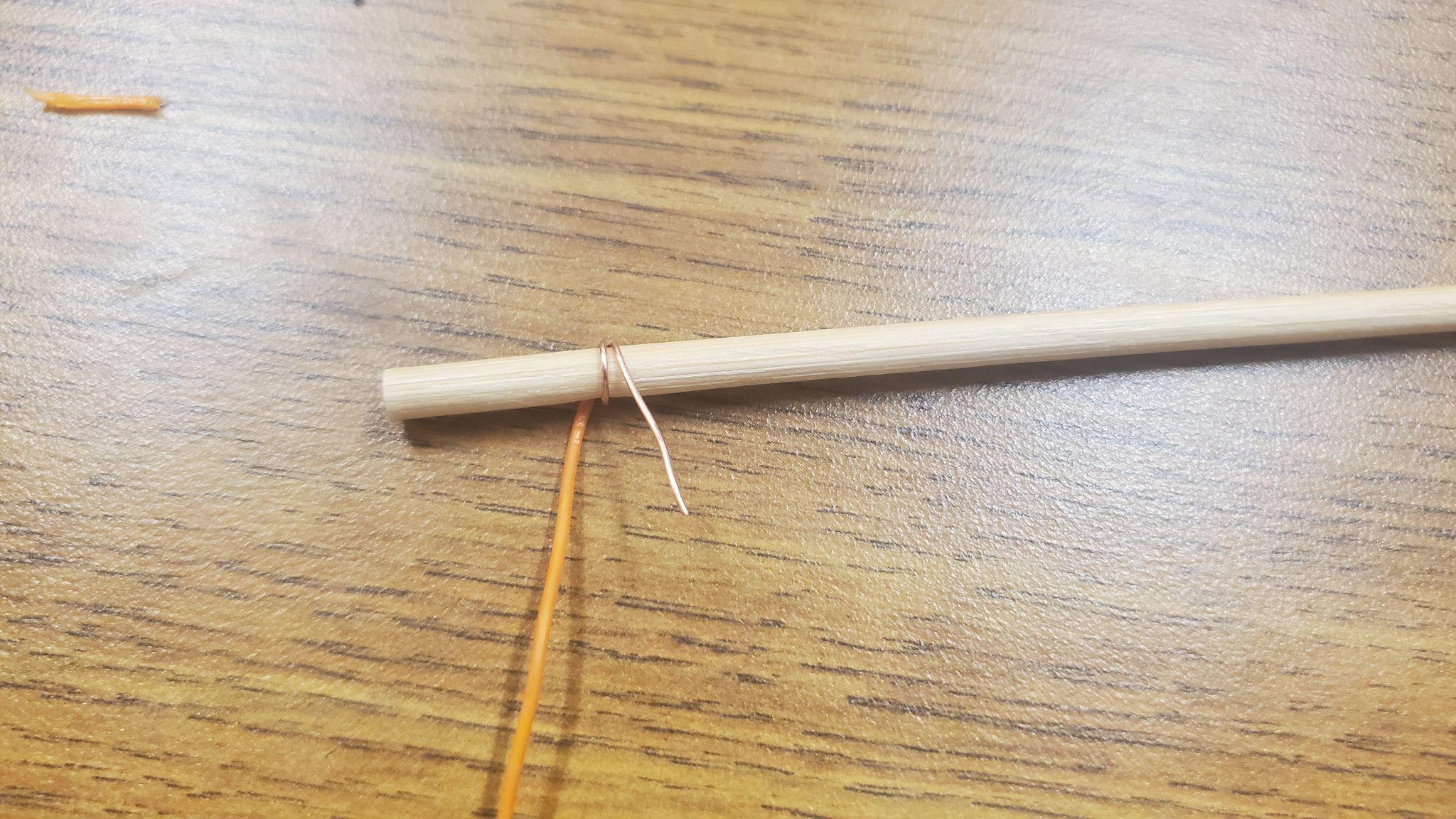 Take the skewer and wrap the wire with the longer stripped side around it.