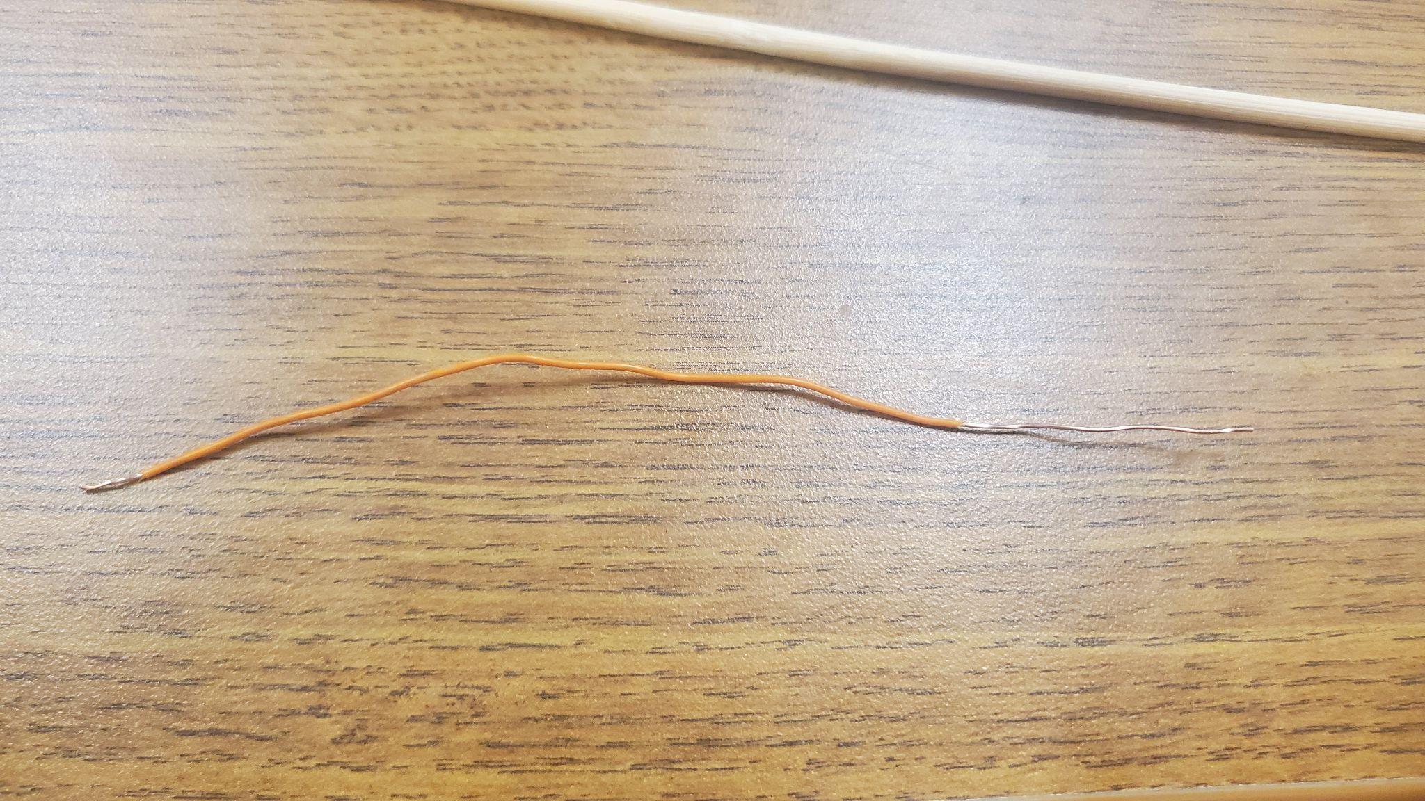 First take the stiffer wire (one that is harder to bend) and strip a bit off one of the ends. Do the same with the other side but strip a lot more off.