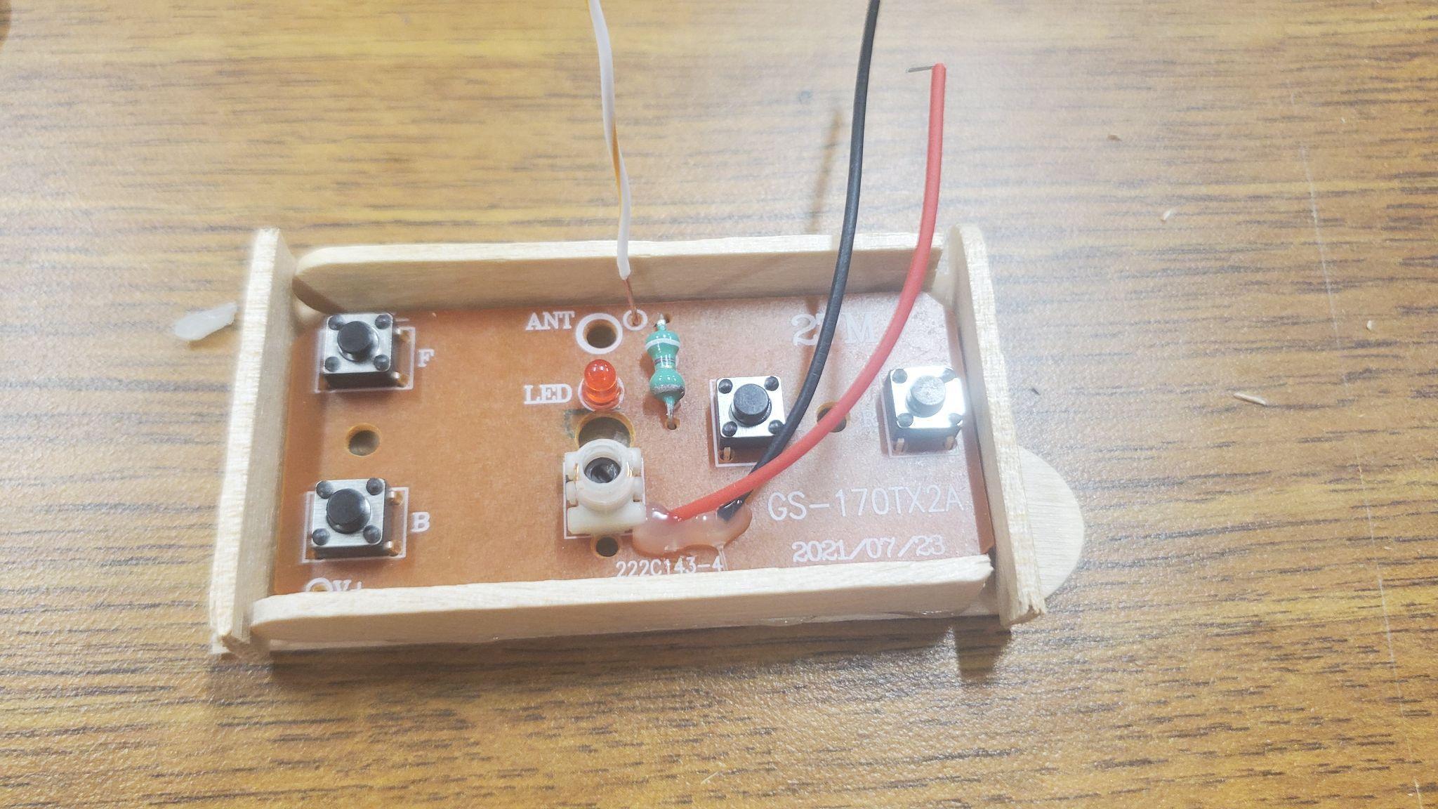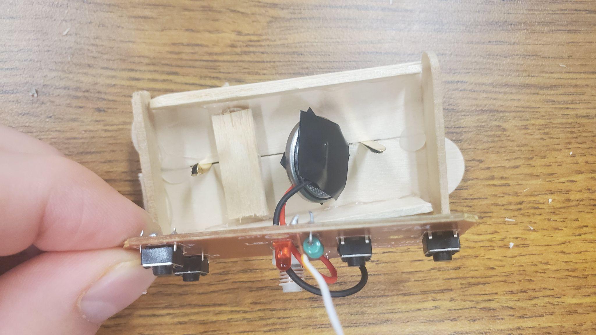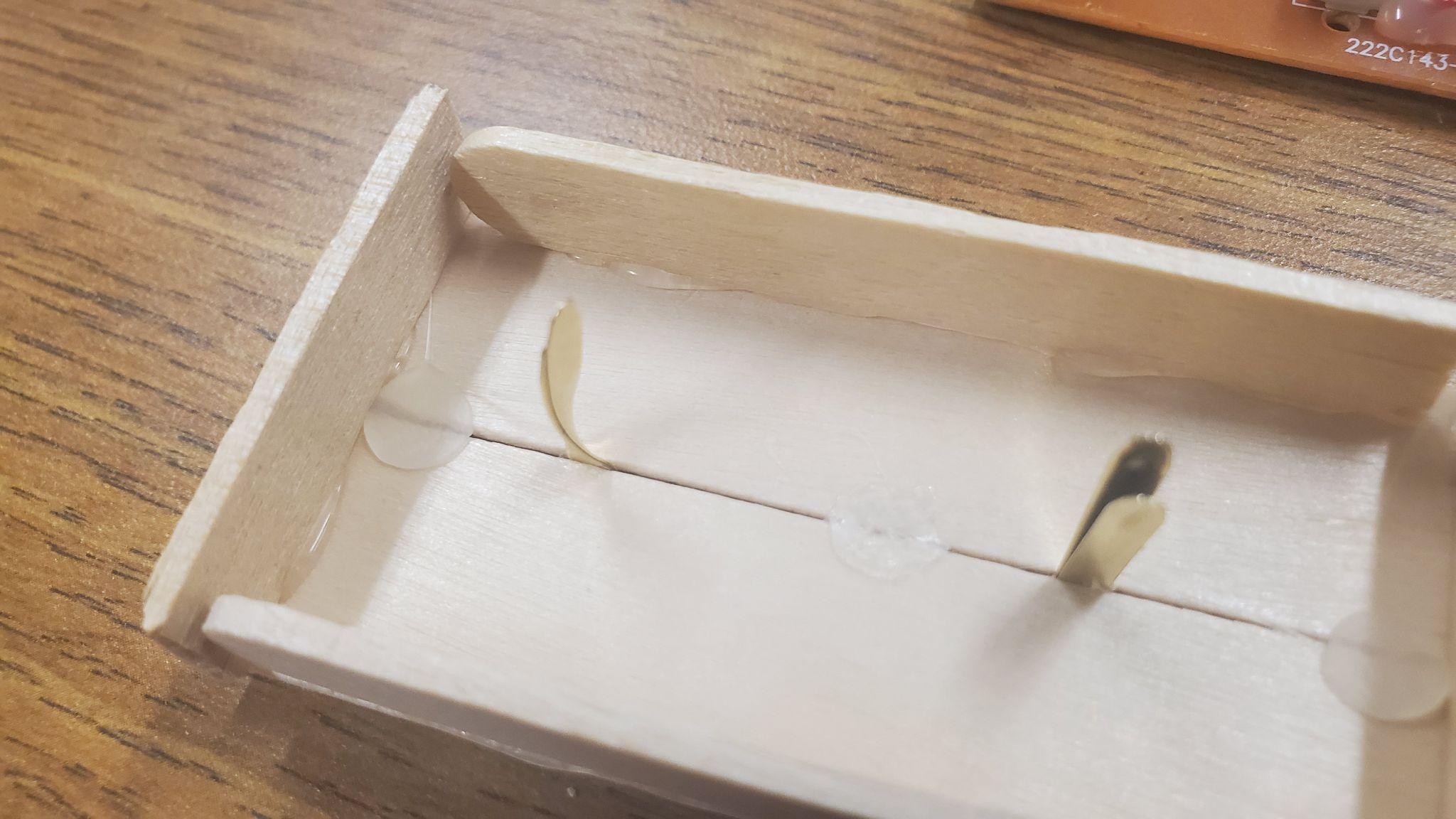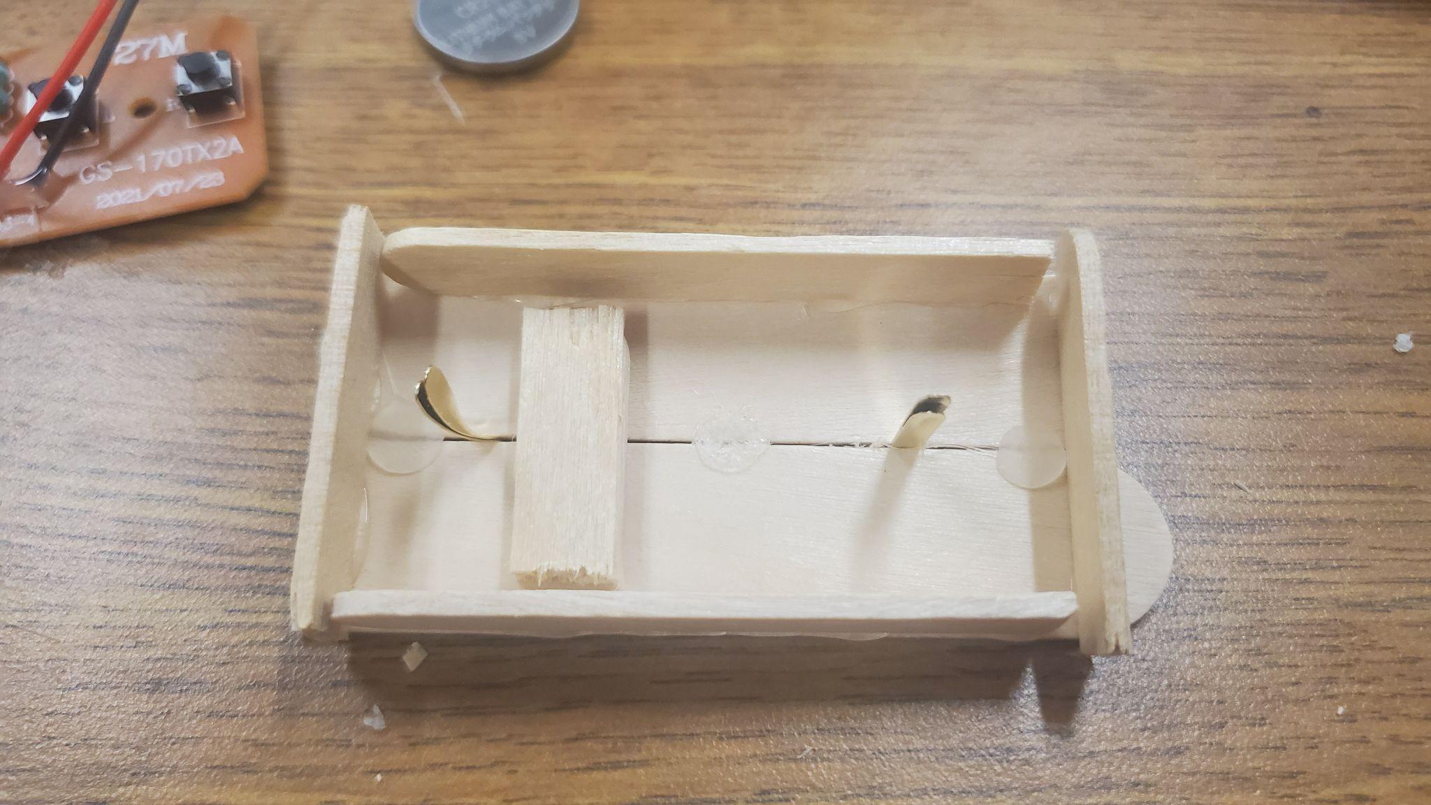 Take the transmitter circuit out and flip over the box. Put two 3/4 inch brass fasteners through the two jumbo popsicle sticks (between the hot glue dots).